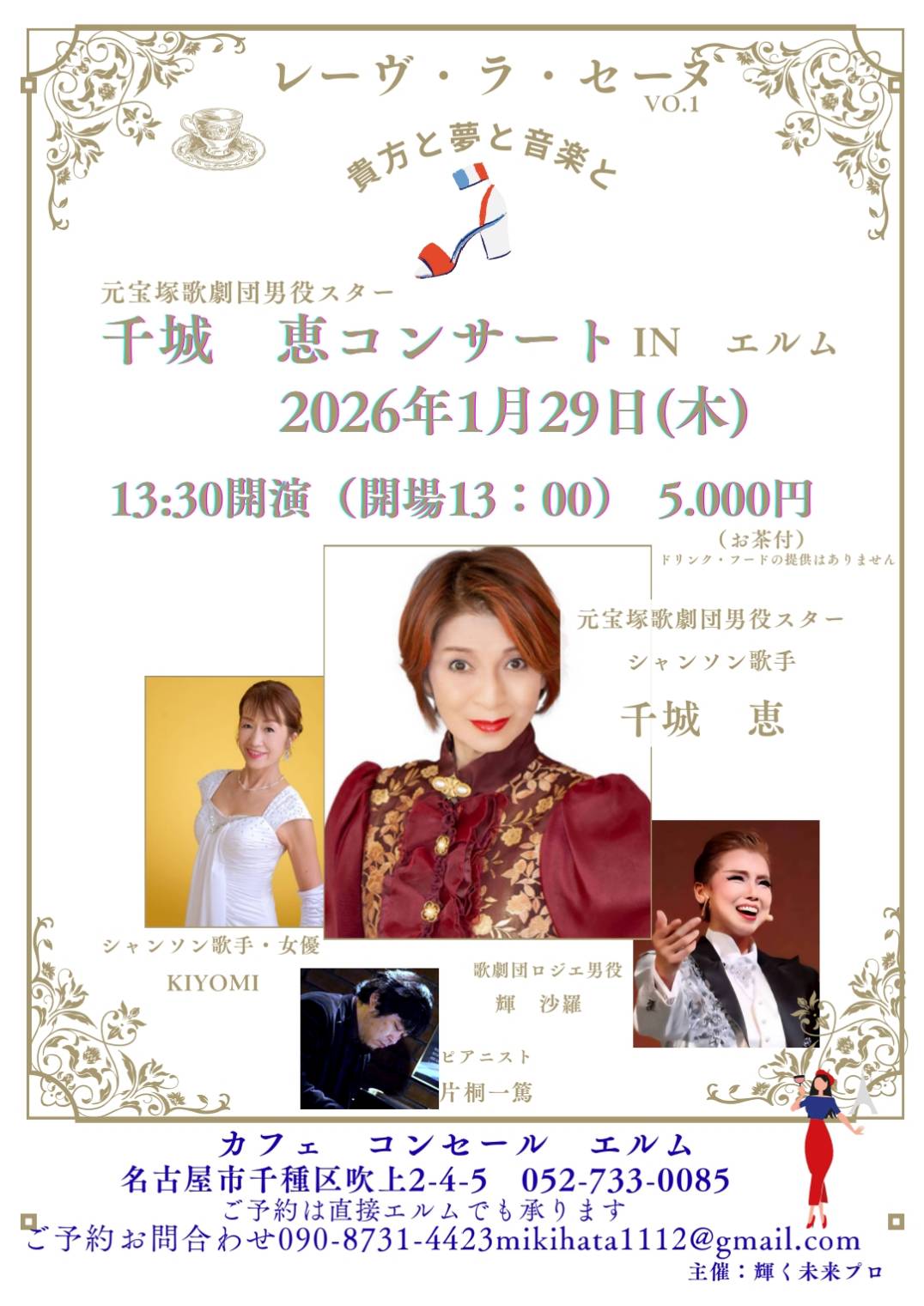 2026 1/29 千城 恵コンサート IN エルム 千城 恵 2026年1月29日(木) 【出演】千城恵(vo)KIYOMI(vo)輝沙羅(vo)片桐一篤(pf) 【金額】5,000円(飲食提供なし、お茶付) 【時間】open 13:00 / start 13:30 【場所】Café concert ELM 【ご予約】 TEL 052-733-0085 Post Share Line 記事のタイトルとURLをコピーする イベント一覧 2026年1月29日のイベント 2026 1/29 渡辺実枝子 渡辺実枝子2026年1月29日(木) 【出演】渡辺実枝子(vo)山下力哉(pf) 【金額】3,500円+1オーダー 【時間】open 19:00 / start 19:30 【場所】Café concert ELM 【ご予約】 TEL 052-733-0