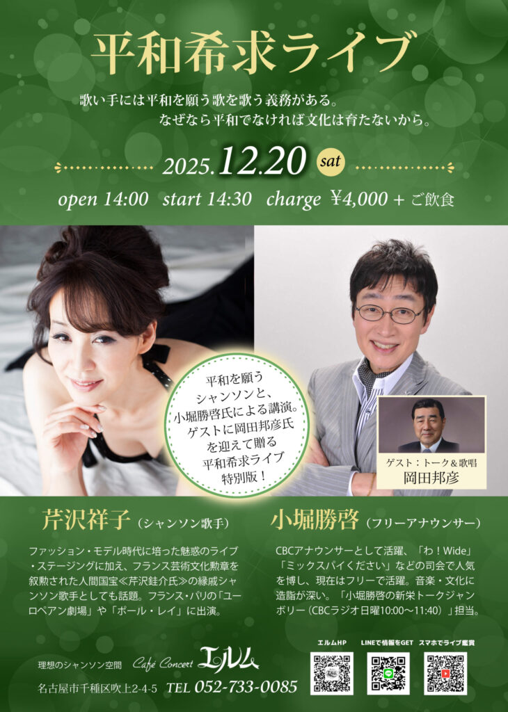 2025 12/20 平和希求ライブ~芹沢祥子×小堀勝啓~ GUEST:岡田邦彦 時間 start 14:30 2025/12/20(土) 【金額】4,000円+1オーダー 【時間】open 14:00 / start 14:30 【場所】Café concert ELM 【ご予約】 TEL 052-733-0085 Post Share Line 記事のタイトルとURLをコピーする イベント一覧 2025年12月20日のイベント 2025 12/20 start 19:30 真路まなみ 2025/12/20(土) 【金額】3,500円+1オーダー 【時間】open 19:00 / start 19:30 【場所】Café concert ELM 【ご予約】 TEL 052-733-0085